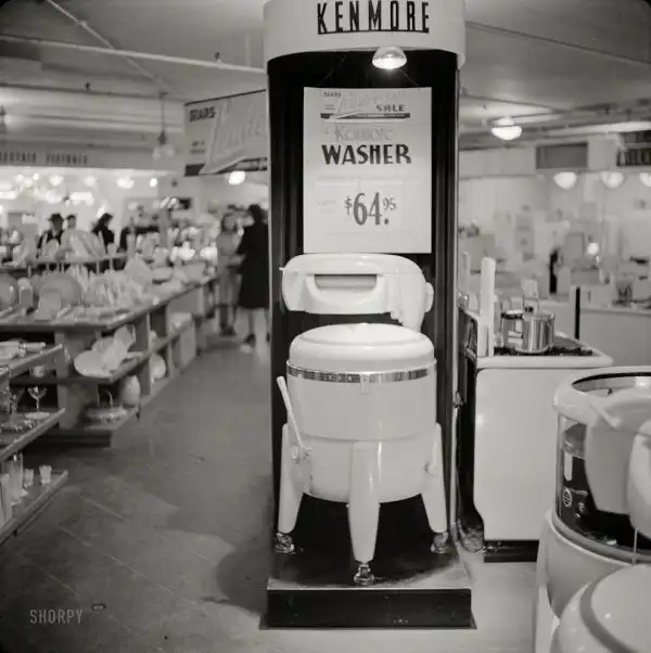В магазине бытовых товаров (на первом плане - стиральная машина); Сиракузы, штат Нью-Йорк,