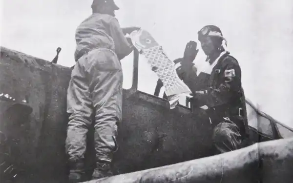 Японский летчик-камикадзе получает воздушного змея в качестве талисмана перед вылетом на боевое задание на базе японских армейских ВВС Тиран (префектура Кагосима).