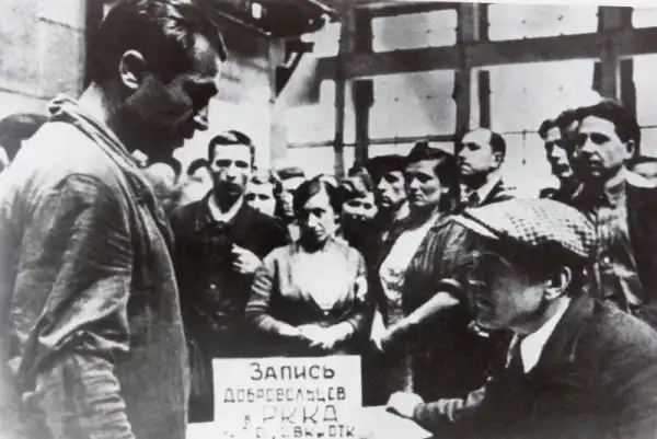 Запись добровольцев в Красную Армию на заводе имени Сталина в Ленинграде.