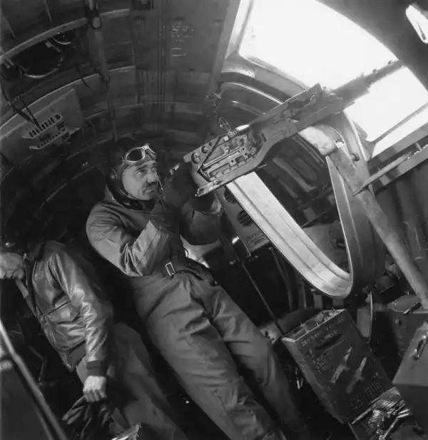 Знаменитый американский актер, лейтенант ВВС США Кларк Гейбл (William Clark Gable 01.02.1901-16.11.1960) стреляет из бортового пулемета «Браунинг» М2 бомбардировщика B-17, во время съемок пропагандистского фильма, рассказывающий о налете американской авиации на Антверпен (Antwerpen), в котором Гейбл лично принимал участие. Кларк Гейбл закончил курсы воздушных стрелков и был приписан к 508-й эскадрилье, 351-й бомбардировочной группы, 8-й воздушной армии ВВС США (508th Bomb Squadron, 351st Bombardment Group (Heavy), 8th Air Force).