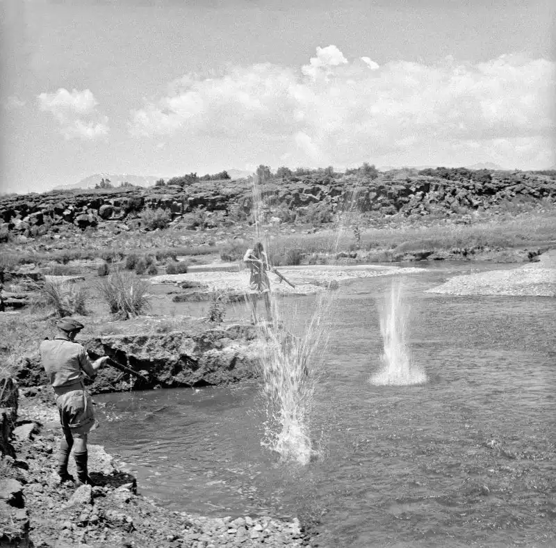 Новозеландские солдаты на берегу реки стреляют по форели на турецко-сирийской границе, 1942 год.