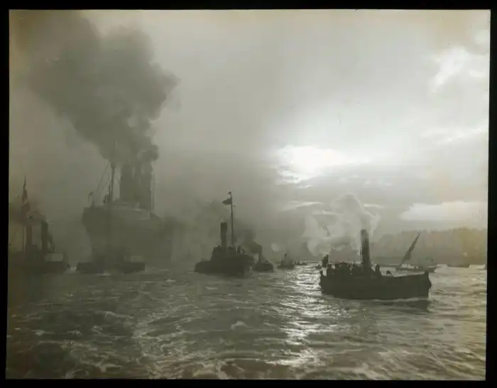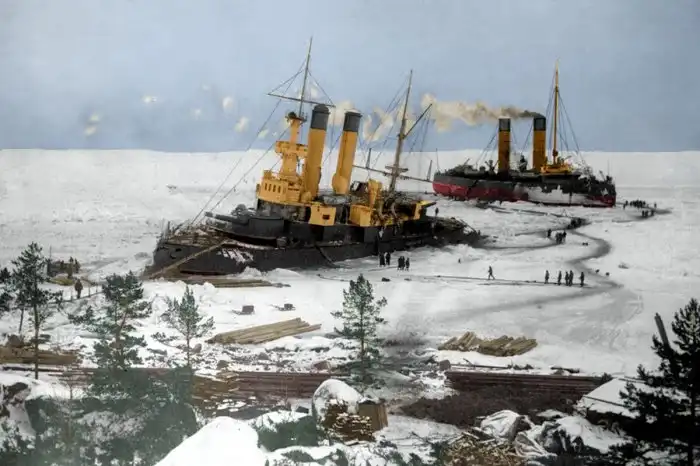 Первый в мире полярный ледокол - “Ермак“. Раскрашенное фото, на котором он изображен при снятии с камней броненосца береговой обороны "Граф Апраксин", 1899 год.