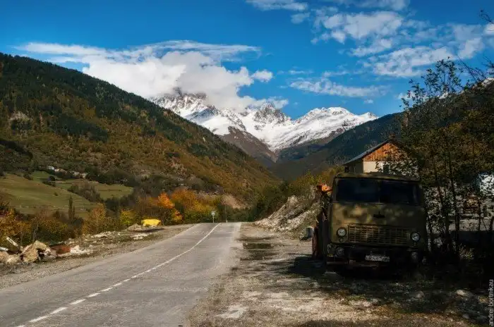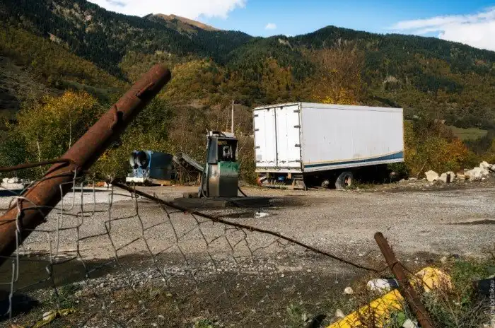 На своем пути мы встретили заправку. Сложно сказать, что привело к ее заброшенности. Вполне возможно, бизнесмены, приехавшие в поселок, стали заложниками потрясающего вида на ледники Кавказа, что забыли о своих намерениях, оставив без дела не только АЗС, но и прицеп, а также грузовик Маз.
