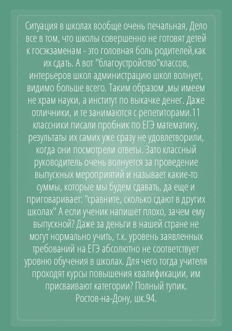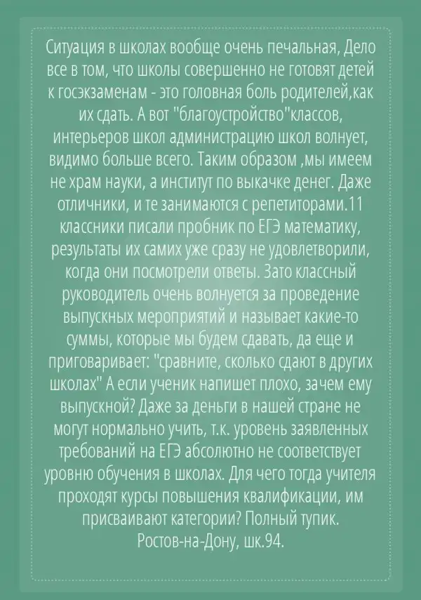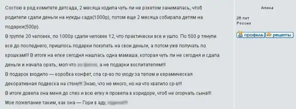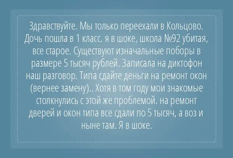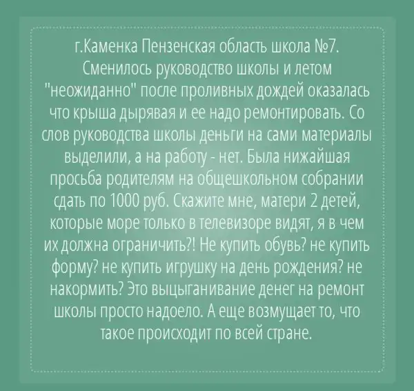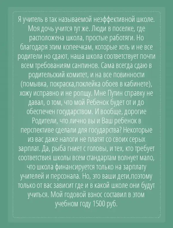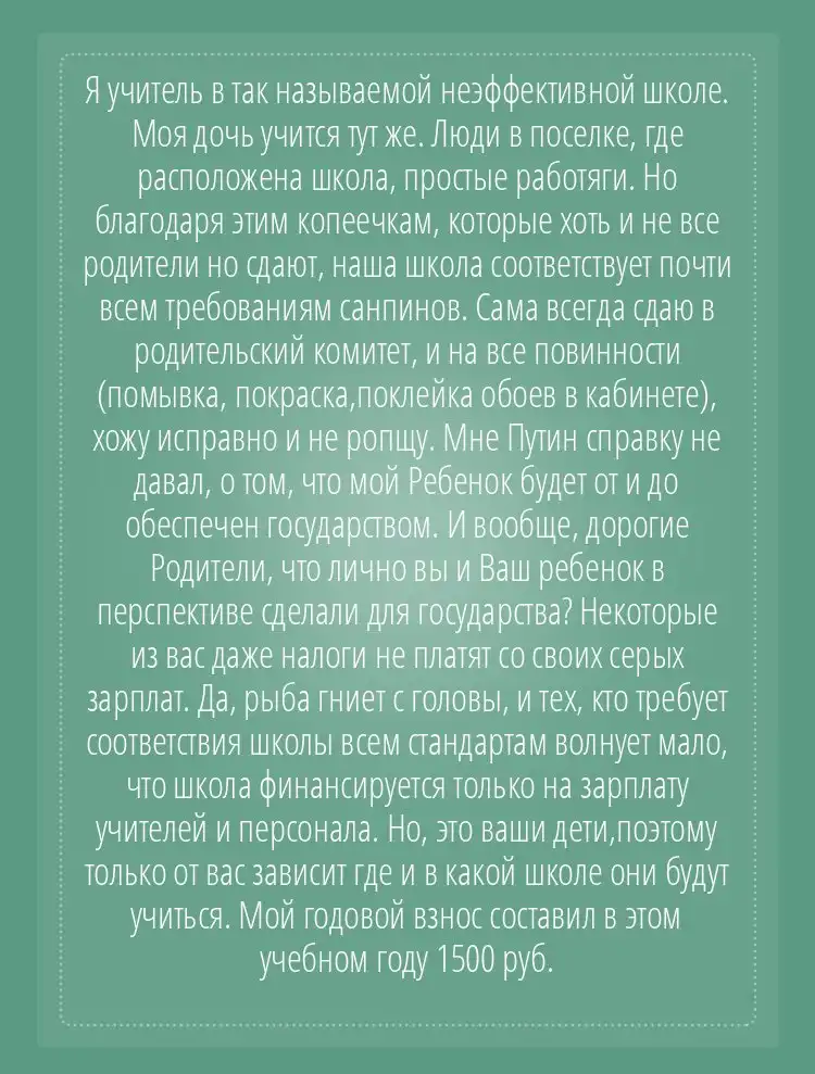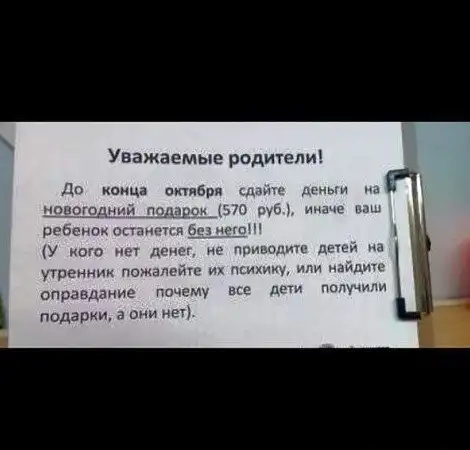 Моя знакомая только вчера пожаловалась - сдали ко дню учителя на подарок учителям по 500 рублей, а сейчас родительский комитет собирает на подарки к Новому году, уже по 1000. Знакомая причитает - где я возьму ту тысячу, мне бы кто подарил такой подарок, хотя бы рублей на 500, полгода не могу сходить к зубному врачу - ни копейки из бюджета не выделить, а тут подарки. И главное, что бОльшая половина класса приняла этот посыл с восторгом, а те, кто хоть как-то пытался противиться, одариваются весьма недвусмысленными взглядами и фырканиями. И все молчат, боятся за детей, что им будут занижать оценки и всячески третировать, как учителя, так и одноклассники, с посылом от их родителей. При этом мы сдали на ремонт класса, ежемесячно сдаем на всякие классные нужды - воду в кулере, салфетки, мыло и прочую хозяйственную мелочь. нет вопросов - это нужно. Но подарки? Ремонт?