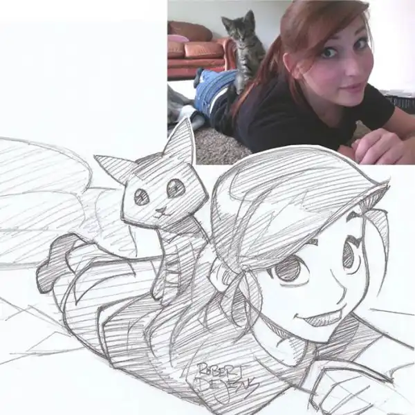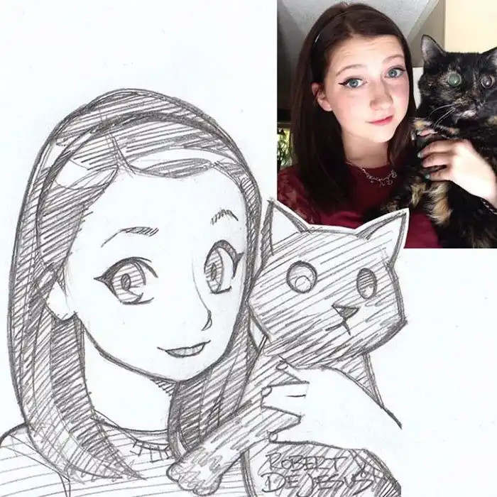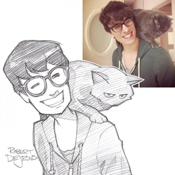 Американский художник-иллюстратор Роберт ДеДжезус обожает мультфильмы. Поэтому его хобби - превращать людей и животных в мультипликационных персонажей. "Я со школы обожал рисовать в стиле аниме и манга, - рассказывает Роберт. - И до сих пор прежняя страсть не оставляет меня". По словам Роберта, у него уже стоит очередь клиентов, желающих получить портрет в таком стиле. На сей раз Роберт представил публике мульт-портреты людей с их питомцами.