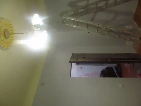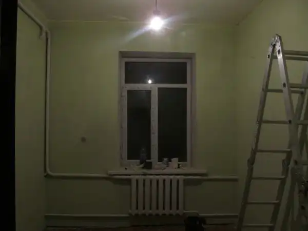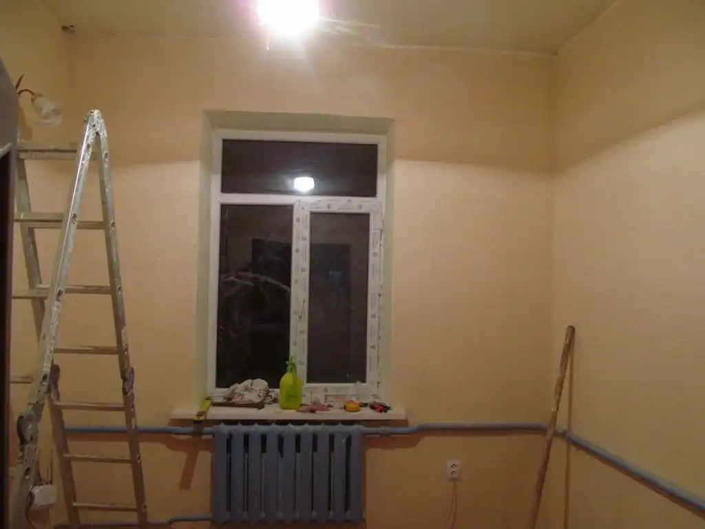 Следующая была спальня. Работа была уже оптимизирована. Сразу отшкрябал стены и потолок от известки. Далее пошел в ход гипсач. В левом углу - эдакая колонна. Что она закрывает? Дело в том, что дом с цокольным этажом и под спальней располагается "котельная". Там и топочный котёл, и запас угля на всю зиму. А через комнату проходит выхлопная труба и труба подачи горячей воды в систему отопления. Выглядело это стрёмно, поэтому я решил закрыть трубы гипсачом. Сейчас, зимой, помимо основного обогрева батареями, вот этот гипсовый короб работает ещё как контрамарка (отдает тепло от разогретых труб), так что спальня самая теплая.