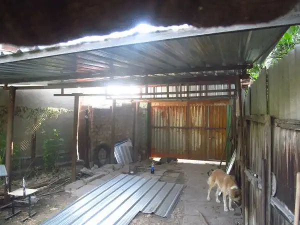 Старый навес был шиферный. Я его приподнял и удлинил ещё на одну секцию. Теперь и машина, и собачьи будки были под навесом.