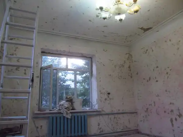 Итак, зал. Взяв шпатель и опять начал отдирать известку от стен и потолка. Местами она слоями слетала, а местами держалась крепко.