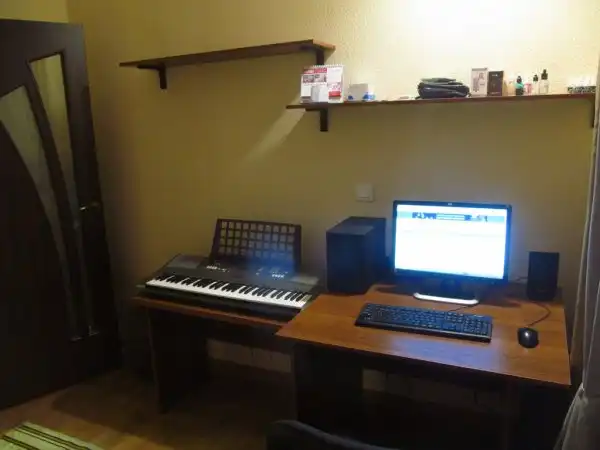 Стол-книжка никак не подходил для синтезатора (посадка не та), поэтому по собственным примитивным чертежам пошел на распил и собрал себе стол. И полочки запилил.
