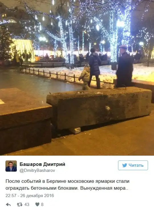 После теракта в Германии 20 декабря, когда террорист на грузовике въехал в толпу людей, власти Берлина огородили рождественские ярмарки железобетонными блоками, чтобы предотвратить возможные новые атаки.