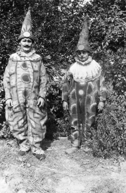 2 немецких военнопленных одетых в костюмы клоунов для театрального представления в лагере для своих 360 пленных товарищей. Франция, примерно 1914-1918 гг