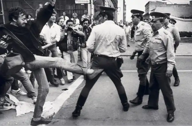Фотограф из Западного Берлина во время демонстрации даёт пинка полицейскому, который находится по другую сторону границы в Восточном Берлине, 13 августа 1986 года