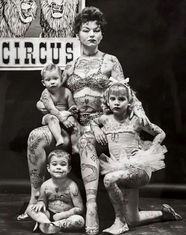Татуированная цирковая семья, мать и дети, 1965 г