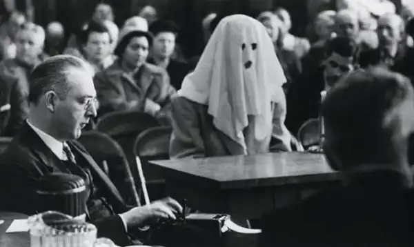 Замаскированный секретный свидетель даёт показания в зале суда по делу о наркотиках. Вашингтон, 30 апреля 1952 года