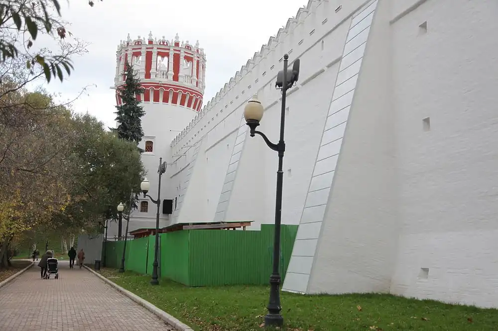 Москва. Опоры стен Новодевичьего монастыря потемнели (видимо, из-за влаги).