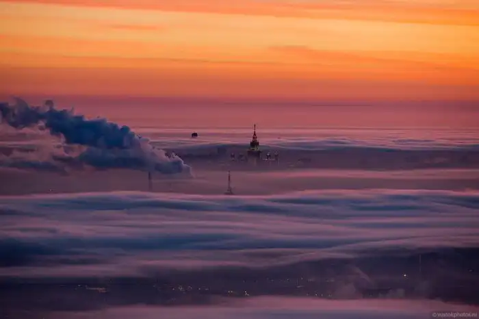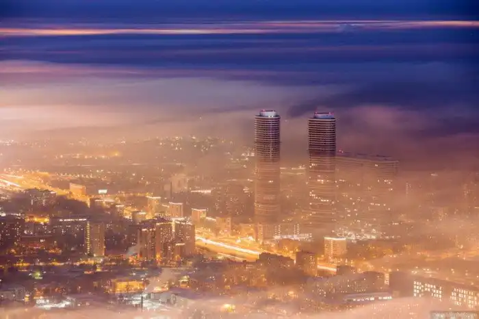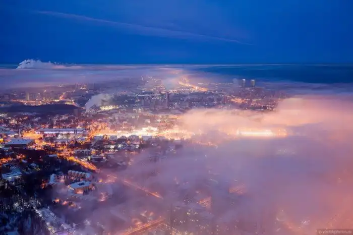 "Такая погода бывает всего несколько раз в году. Когда после сильных морозов приходит теплый циклон и постепенно вытесняет ледяной воздух из города. Именно в такой момент случается красота, которую с земли не видно. Но стоит подняться повыше..."