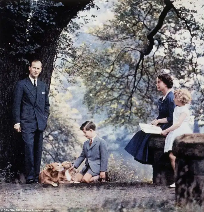 Лесная сказка: королевская семья в парке Букингемского дворца в 1957 году. Королева и принцесса Анна с книжкой на коленях смотрят на принца Филиппа, а принц Чарльз играет со своими корги.