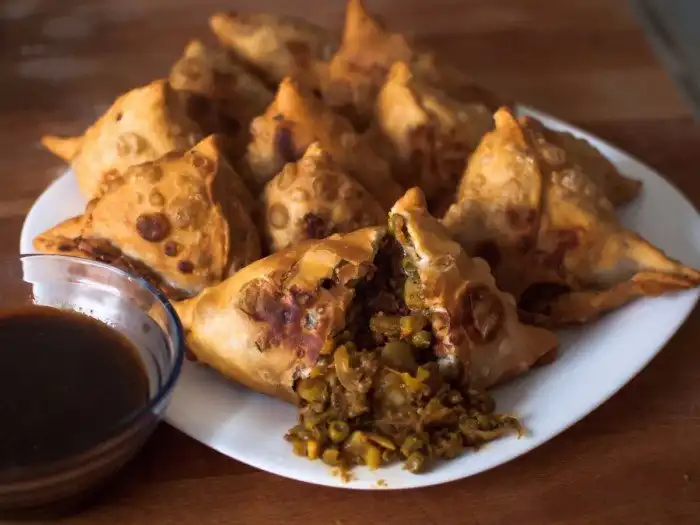 Индия, самоса. Хрустящие индийские пельмени их слоеного теста начиненные пряным картофелем и горохом, чечевицей, фаршем или луком.