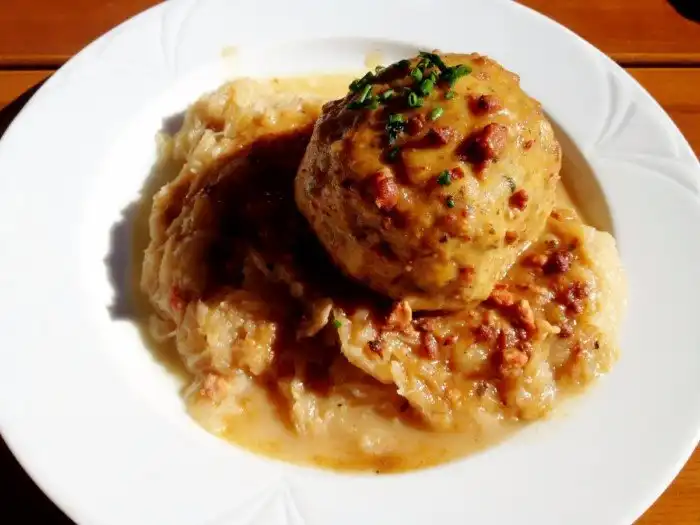 Германия, кнедлик. Отварное изделие из теста или картофеля. Они ничем не начинены, но подаются к мясу, например к шницелю.