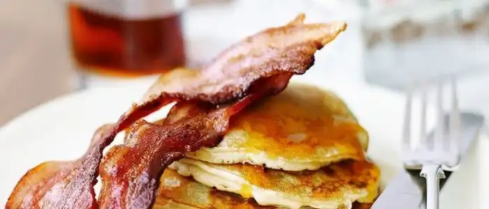 Не уступают курице с вафлями по популярности и блинчики с беконом и все тем же кленовым сиропом.