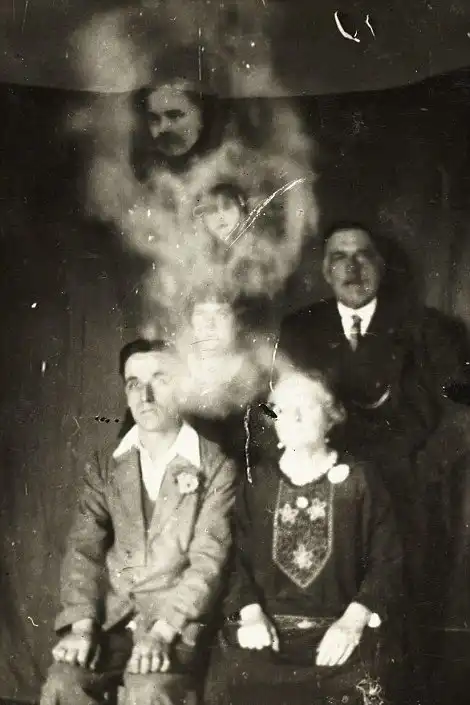Фото, которые ждут вас далее, были сделаны британским фотографом-спиритуалистом Уильямом Хоупом (William Hope) и наделали немало шума в первой трети XX века. В те годы общество было увлечено мистикой и спиритизмом, а потому снимки Хоупа с изображением «призраков» получили большой успех. В 1920 году Хоуп устраивал выставки, показывая свои фотографии всем и везде, и многие были уверены в том, что они действительно видят приведений. Позже выяснилось, что далеко не все фото были подлинными, так как Хоуп зачастую использовал двойную экспозицию, в результате чего на пленке оставалось двойное изображение.