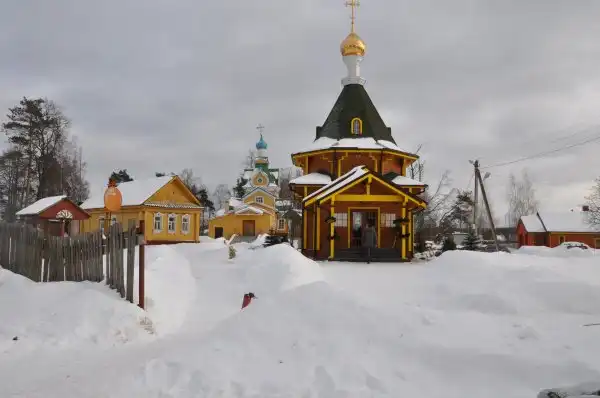 Надо сказать, что население этих мест не было сплошь старообрядческим. Есть много сёл, где храмы принадлежат господствующей церкви. Вот один из прекрасных примеров – Введенский храм в деревне Рыжёво. Храм уникальный, хоть и подлежит скорой реставрации. В конце 19-го века в Москве проводилась торгово-промышленная выставка. Одну из медалей на выставке взяла эта деревянная церковь, быстро собираемая и быстро разбираемая, в нео-русском стиле, стоявшая ранее в Александровском саду близ Кремля. После выставки церковь была разобрана и за неделю смонтирована в другом месте. Уникальна ещё она и тем, что была снова перевезена и смонтирована в деревне Рыжёво в 1927 году, когда к церкви относились прямо скажем подозрительно.