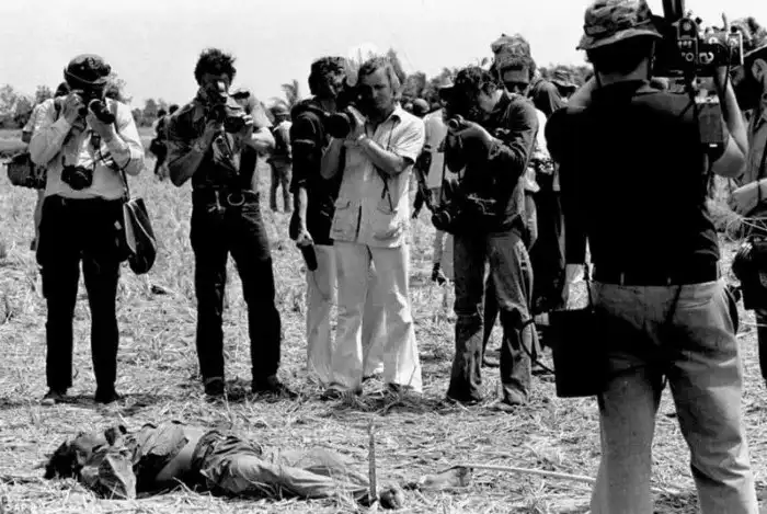 На войне случаются казни, и не всегда эти казни приводятся в исполнение после справедливого суда или с соблюдением каких-то правил. На этой известнейшей фотографии генерал Нгуен Нгок Лоан (начальник национальной полиции) стреляет в голову вьетконговского офицера Нгуена Ван Лама прямо на оживленной улице в Сайгоне 1 февраля 1968 года. После выстрела Лоан сказал журналистам% "Эти парни убили много наших и я думаю, что Будда простит меня".
