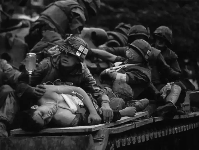 Начиная с Тетского наступления война постепенно пошла на убыль и американские войска начали уходить. Америка не была разгромлена, но она явно проиграла в этой войне. На снимке - отголоски сражения: раненые солдаты американской армии, которых эвакуируют из города Хюэ в центральной части Южного Вьетнама. Страх и усталость на лицах, повязки и кровь, - все это обыденная жестокость войны.