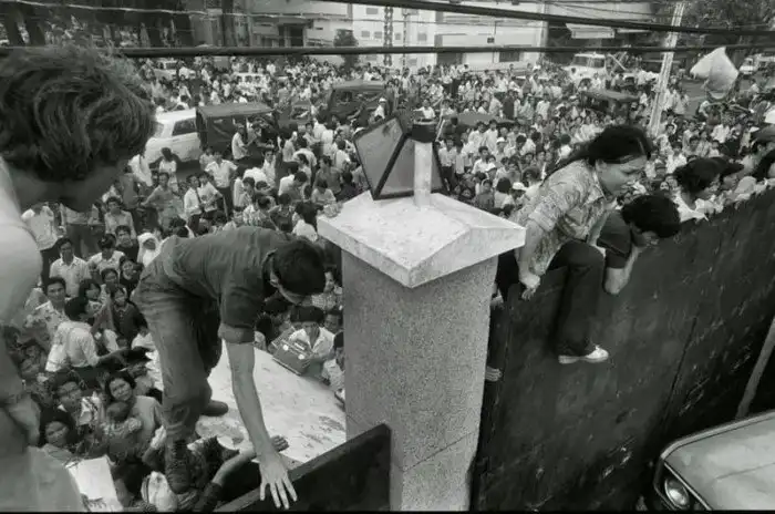 Представьте, что вы работаете в американском посольстве в Сайгоне - серьезном правительственном учреждении - и вдруг видите, как на вашу территорию через стены перелезают толпы людей. Эту сцену увидели дипломаты, их семьи, солдаты, служащие посольства и репортеры. И эти люди не атакуют посольство. Они пытаются спрятаться на его территории. Их мир рушится, потому что северовьетнамские войска и вьетконговцы с триумфом входят в Сайгон, победив в долгой и ужасной войне. Этот снимок сделан 29 апреля 1975 года, всего за день до окончательного падения Сайгона, и показывает всю силу отчаяния проигравшей стороны.