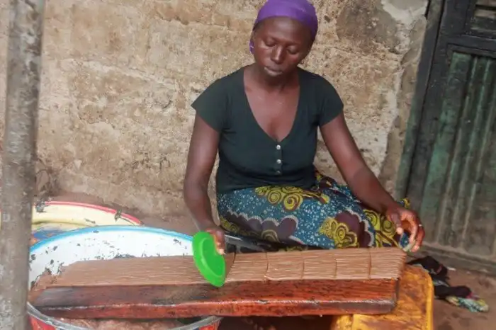 Нигерийская женщина режет кули-кули — это делается из арахиса и похоже на щербет, но с местными особенностями. Кули-кули можно есть чистым, а можно замешать с кокосом, специями или парой местных фруктов