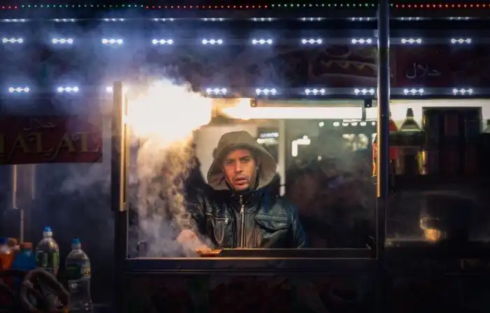 Уличный фастфуд в Нью-Йорке в конце рабочего дня. На лице этого мужчины большими буквами написано, как непросто жить в ритме Нью-Йорка.
