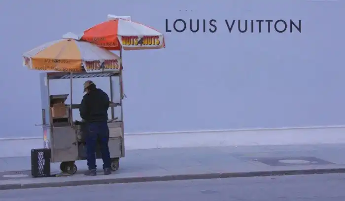 Контрасты Нью-Йорка: ранним утром, мужчина подготавливает фургончик фирмы “Nuts 4 Nuts” к началу рабочего дня на Пятой Авеню. Большинство его покупателей (в том числе. посетители бутика Louis Vuitton прямо напротив) работают в офисах и ещё даже не проснулись.