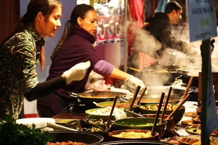 На первый взгляд можно подумать, что дело происходит ночью в какой-нибудь азиатской стране, но нет, это Лондон. Целый рынок уличного фастфуда.