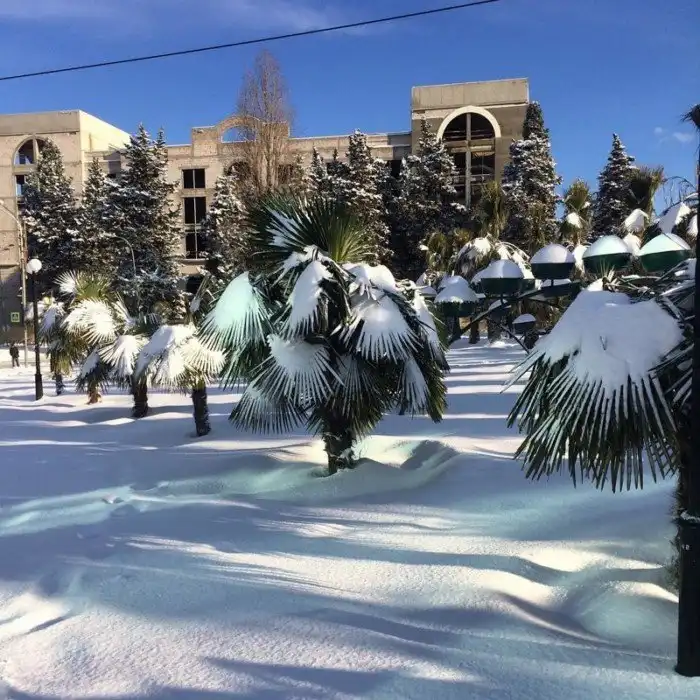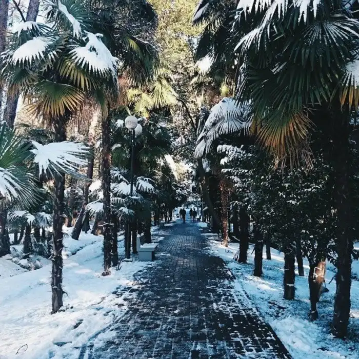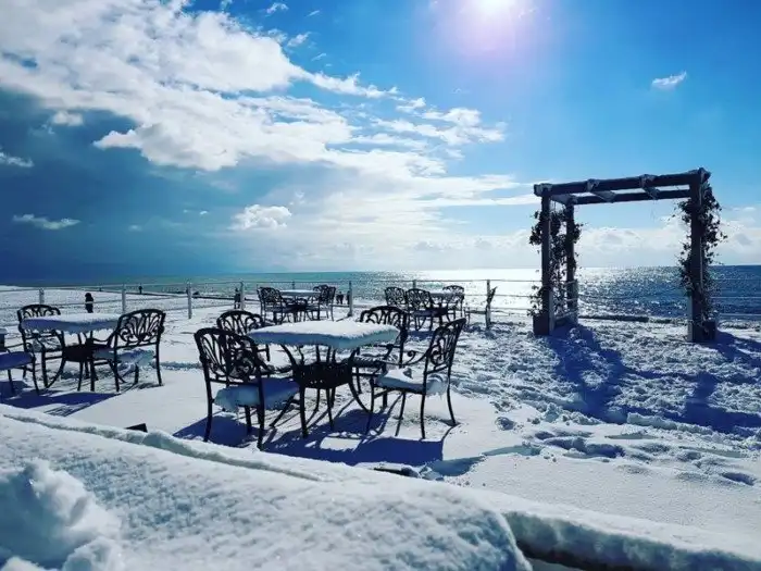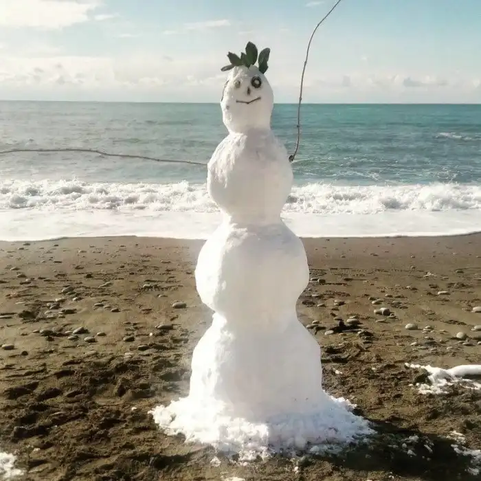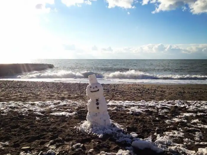 Жители курорта делятся снимками непривычно заснеженных пейзажей в соцсетях и лепят снеговиков на берегу моря.