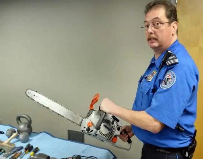 бензопилы не числятся в списке предметов, запрещенных к перевозке в самолетах. Но когда сотрудники службы безопасности обнаружили в багаже пассажира пилу, доверху заполненную бензином, им, конечно, пришлось прочесть ему довольно убедительную лекцию о правилах перевозки легковоспламеняющихся жидкостей. Есть надежда, что после этого оригинал научился сливать бензин перед полетом.
