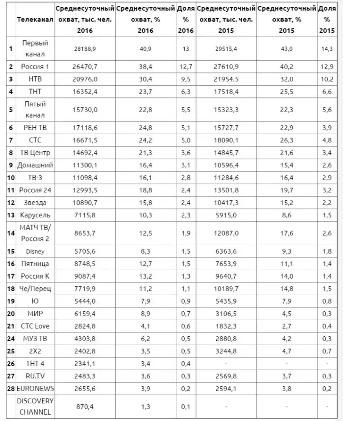 Данные TNS Russia за 1 квартал 2016 года в сравнении с аналогичным периодом 2015 года. Только вдумайтесь, 28 миллионов человек ежедневно смотрит Первый канал!