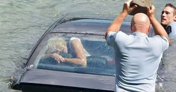 Полиция Окленда пытается спасти женщину, застрявшую в тонущей машине.