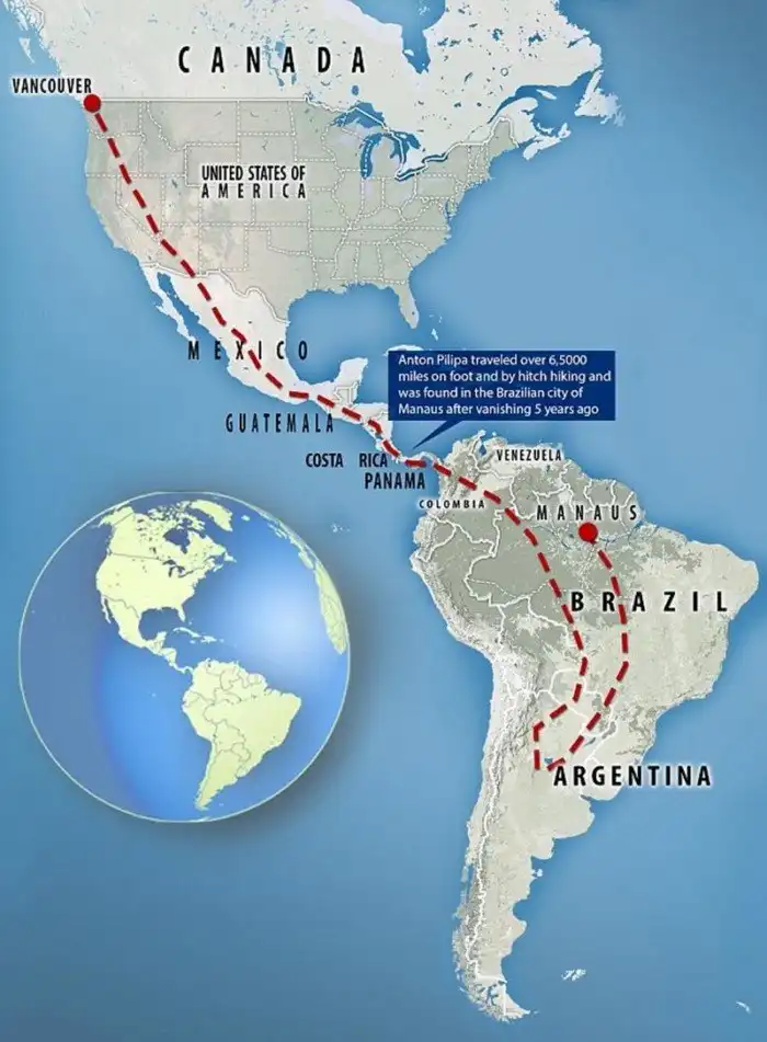 Оказывается, за прошедшие годы Пилипа сумел пересечь десяток стран, включая США, Мексику, Гватемалу, Коста-Рику, Панаму, Колумбию, Венесуэлу, Аргентину и Бразилию, причём без паспорта и практически без никаких вещей.