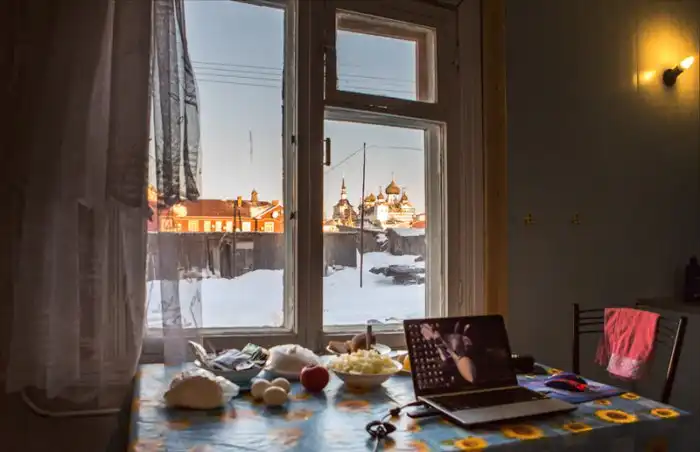 2 комнаты в трёшке нам обошлись в 1200 р. в сутки. Жильё нашли по телефонам, вывешенным на сайте монастыря. Гостиница с завтраками стоила 2500, но нам были нужны отдельные комнаты для работы и возможность самим готовить.
