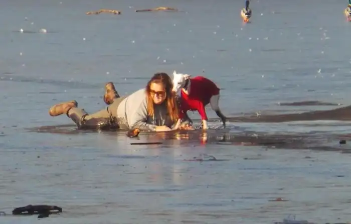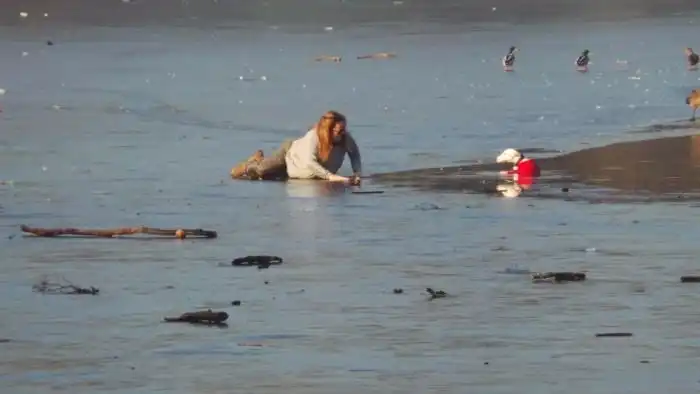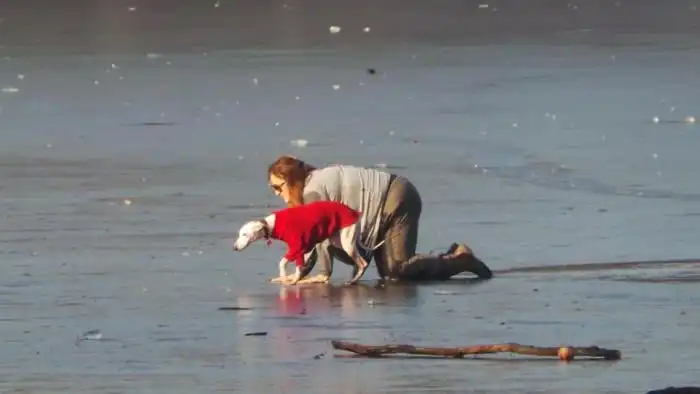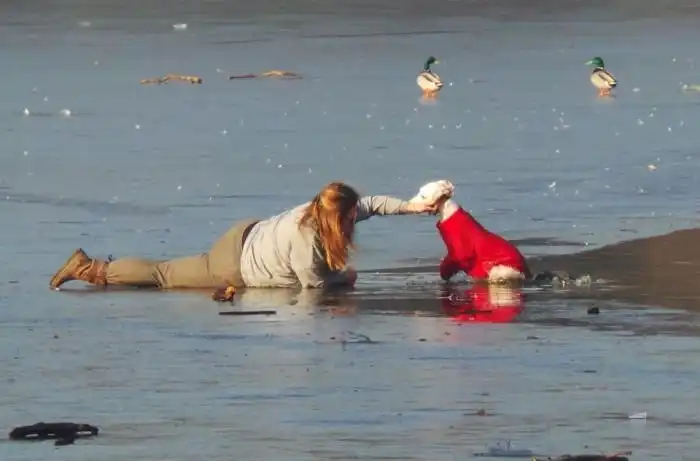 Хозяйка со своим питомцем прогуливалась по окрестностям озера Чингфорд (Эссекс, Англия), когда ее пес, увидев уток на воде, побежал по тонкому льду. Веса пса было достаточно, чтобы лед проломился под ним. Но хозяйка не бросила своего питомца в беде и рискнула самостоятельно выйти на лед для его спасения. К счастью, все закончилось благополучно.