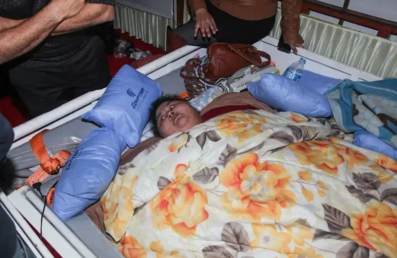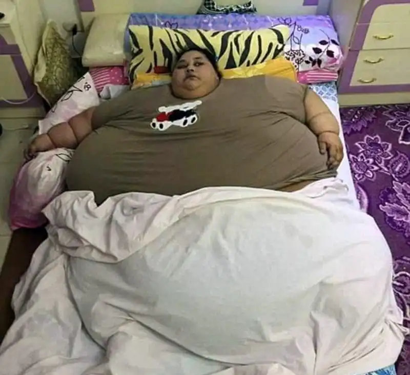 Самая толстая женщина в мире - 36-летняя Эман Ахмед Абд Эль Ати - отправилась из Александрии, Египет, в Мумбаи, Индия, где ей предложили операцию по уменьшению веса (шунтирование желудка). Чтобы доставить 495-килограммовую женщину на борт грузового самолета, пришлось разобрать стену ее дома и извлекать Эман с помощью подъемного крана. Это ее первая за последние 25 лет "прогулка".