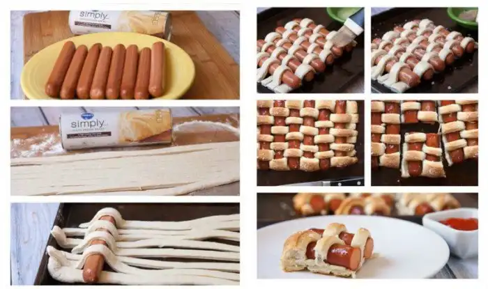 Нарезать тесто полосками, проложить сосиски в шахматном порядке, запечь