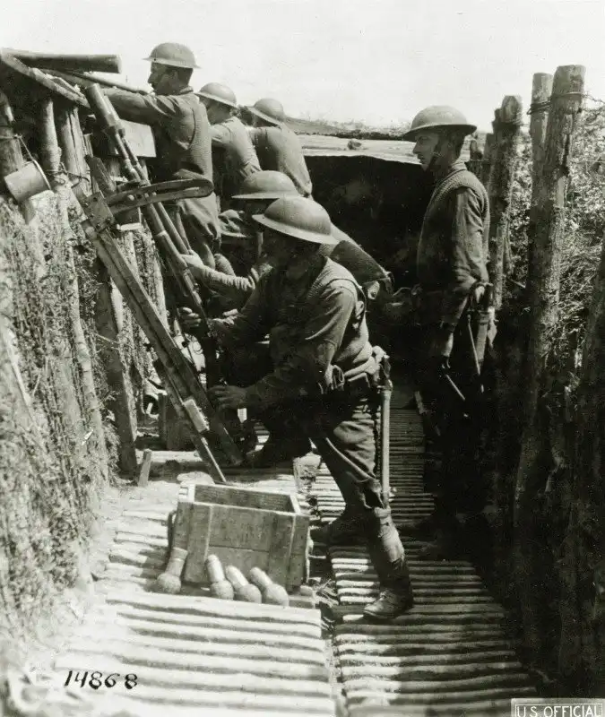 Пехотинцы армии США с винтовочными гранатомётами, Франция 1917-18 гг. Винтовки закреплены на неких лафетах, оснащённых приспособлением для наводки. Фронтовое кулибинство или штатное вооружение?