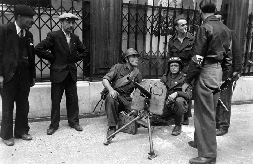 Довольно редкий пулемет Дегтярева ДС-39 у бойцов Свободных французских сил (Forces françaises libres) на улице Лиона. 1944г.