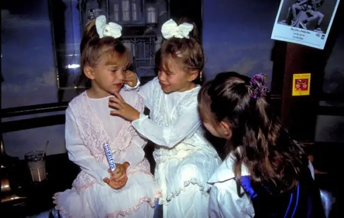 Юные актрисы сестры Олсен готовятся в кстрече с прессой в клубе "Планета Голливуд", 1993 год