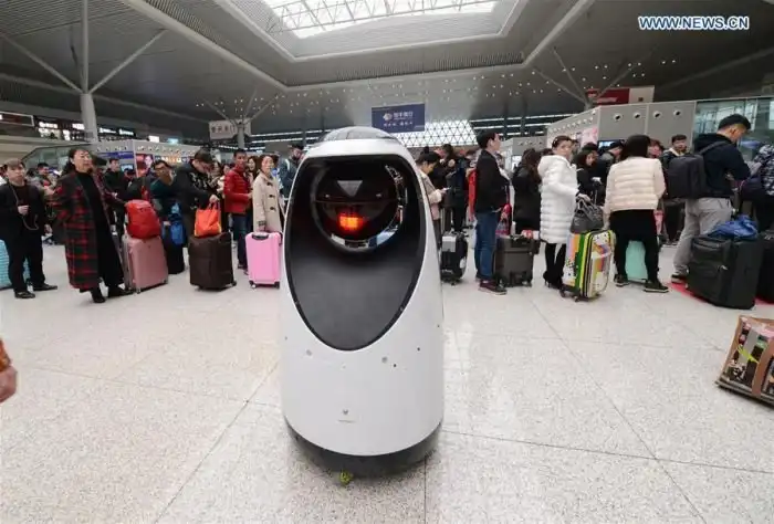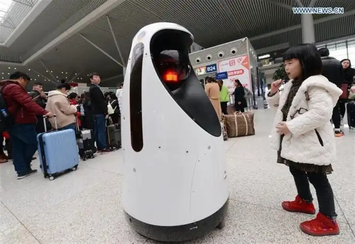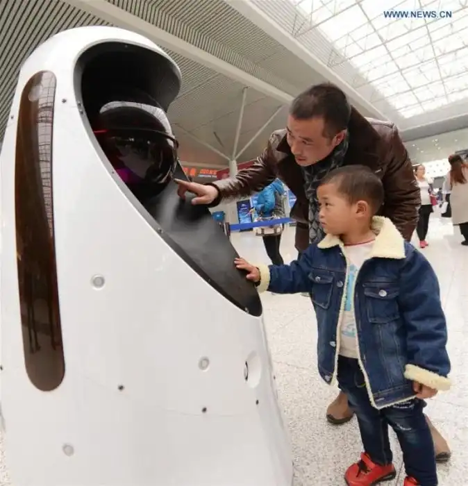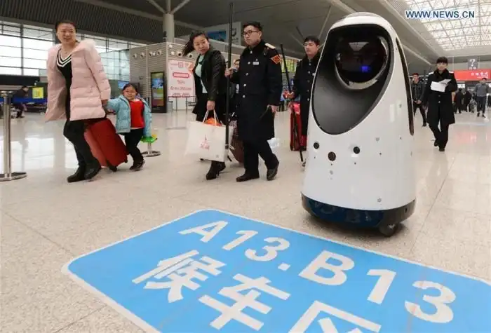 На одном из вокзалов китайского города Чжэнчжоу, провинция Хэнань, начал работать первый робот-патрульный. Робот способен общаться с пассажирами с помощью речи, отвечая на некоторые их вопросы, кроме того он сможет сканировать и распознавать лица людей, помогая тем самым полиции. В остальное время патрульный будет показывать расписание поездов, отслеживать температуру воздуха, предупреждать экстренные службы об угрозе пожара. Робот установлен в зале ожидания, но при этом сможет самостоятельно двигаться.