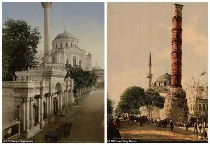 Слева - мечеть Пертевниял Валиде-султан, окрестности Аксарая, Константинополь. Справа - "обожженная колонна" (главный символ Византийской империи, колонна Константина, 330 г. н. э.) на площади Чемберлиташ