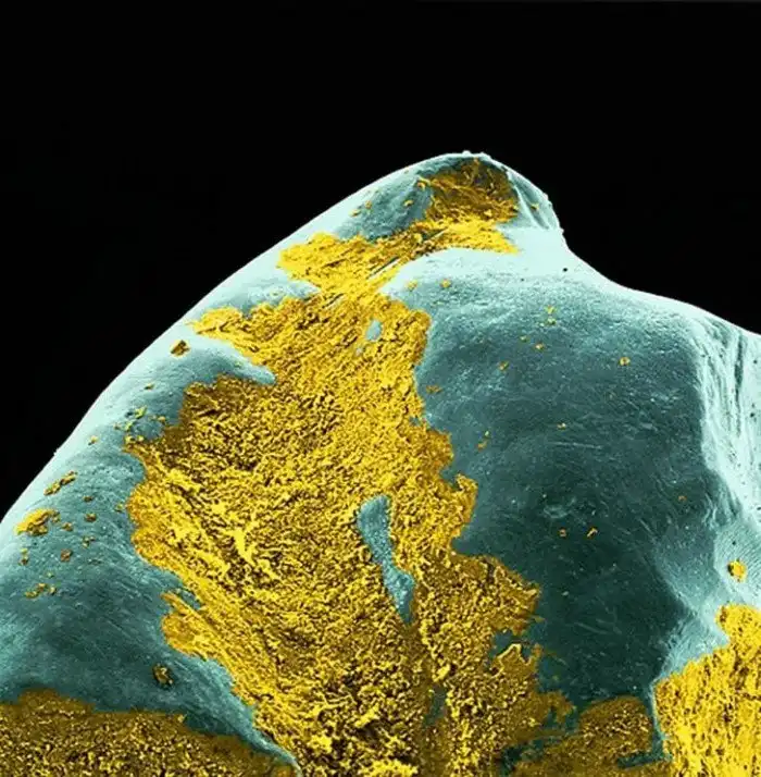 Человеческий резец с дуплом или потерей минералов, вызванной кислотным бактериальным «мусором». В данном случае кариес образовался на боковой стороне зуба (между двумя зубами) и на линии десны (между коронкой — желтым — и корнем), возможно, из-за недостатка чистки зубной нитью или от ее неправильного использования. Британские ученые выяснили, что каждый третий взрослый человек подвержен кариесу, а исследование, проведенное на 5-летних детях в 2012 году, показало, что каждый 4-й из них имеет ту или иную степень кариеса.