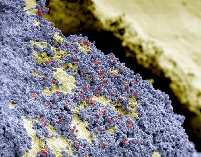 Поверхность человеческого зуба (окрашено желтым), ковер сферических бактерий (окрашено голубым) и кровеносные сосуды (окрашено красным).