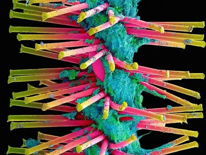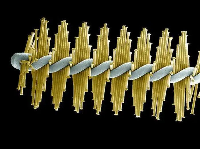 Зубной налет на щетинках использованной зубной щетки при увеличении в 750 раз.